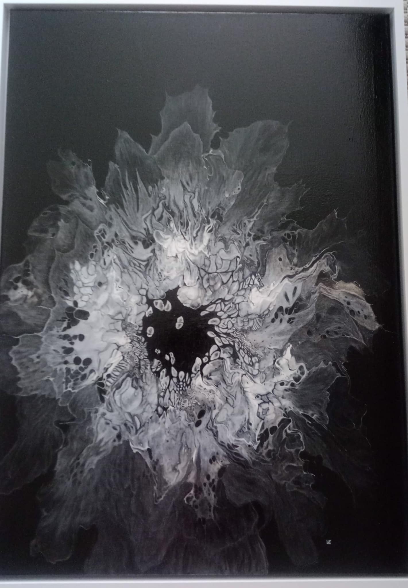 Le blanc éclatant avec des celules, presque lumineux, s’entrelace avec des nuances de gris, qui apportent profondeur et mystère. Le noir, quant à lui, accentue les zones de contraste, souligne la silhouette de la fleur tout en accentuant son côté abstrait, presque parfumé.