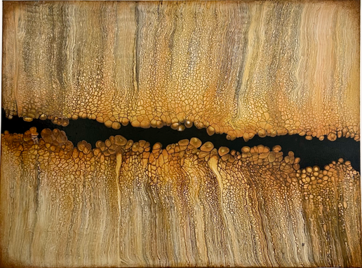 L’œuvre semble capturer un moment figé dans l’instant, un éclatement mystérieux du sol. La fissure noir, grande et imposante, se déploie en un motif tortueux qui serpente à travers la toile. Des touches d’or éclatent comme des éclats de lumière, symbolisant une rupture qui libère quelque chose de précieux. Le cuivre et le bronze, quant à eux, s’entrelacent subtilement autour de la fissure, évoquant à la fois la terre, le métal et le temps.