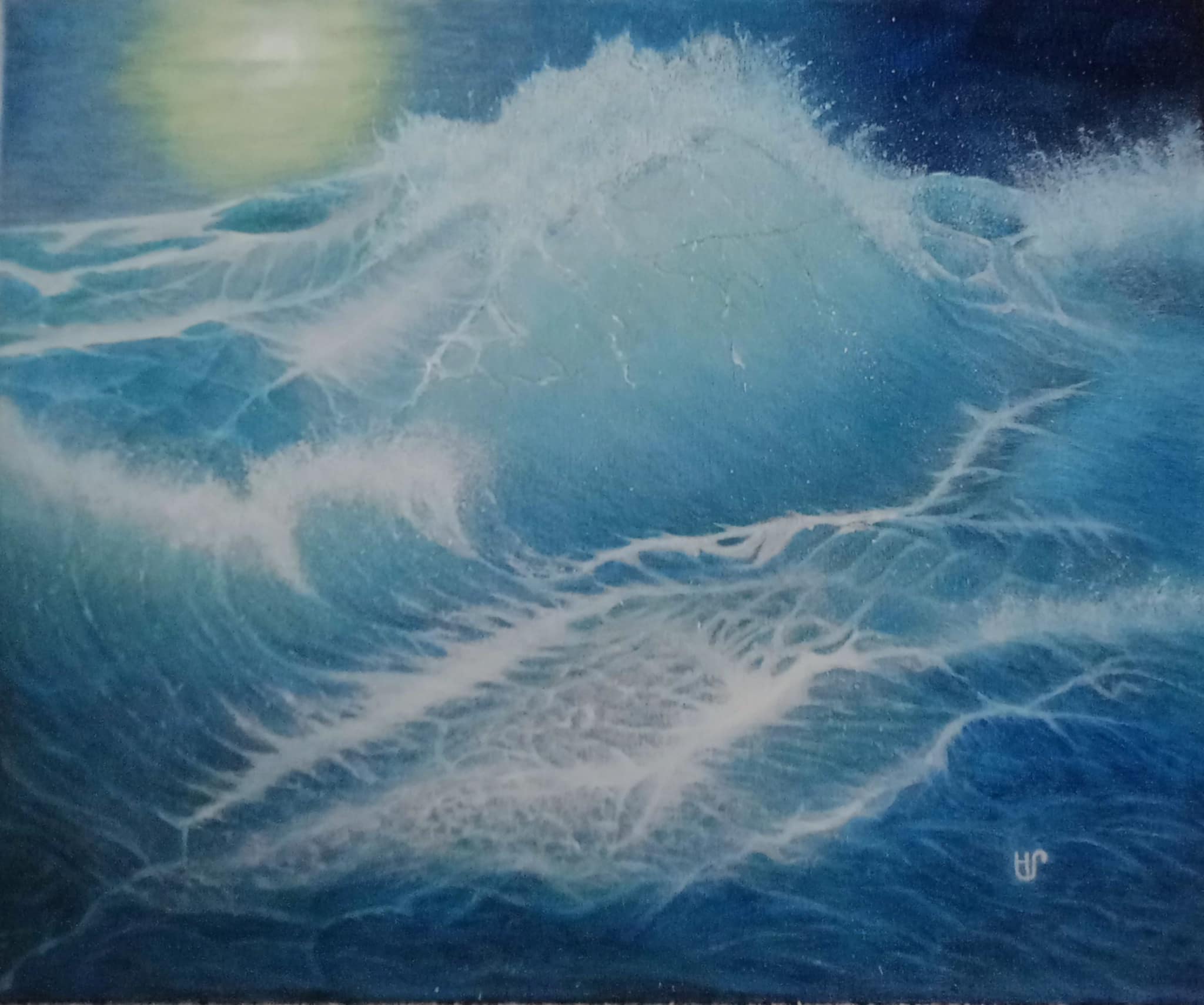 La mer agitée sous l’influence d’un orage imminent . Les teintes profondes de bleu foncé semblent représenter l’aspect menaçant et tourmenté de l’océan, tandis que les bleus clairs suggèrent l’agitation des vagues en mouvement.