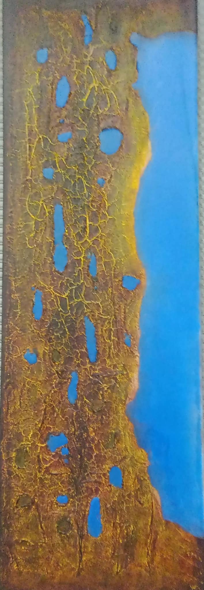 Cette œuvre abstraite avec densité explore la fluidité et la sérénité d’une baie de mer par une composition de peinture acrylique jaune, terre cuite et bleu ciel. Cette œuvre d’art a été finie avec deux couches de vernis brillant de haute qualité et les places de la mer avec la résine professionnel.